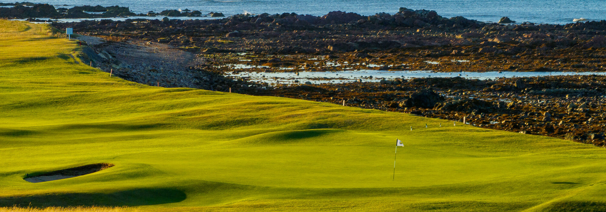 A brilliantly designed short par 4, it features the narrowest of fairways between the deer park wall and rocky beach. You can select any club from driver to 5 iron from the tee. Approaching the green from the right hand side of the fairway offers the best angle into this sloping green. Deep bunkers await any errant shots.
